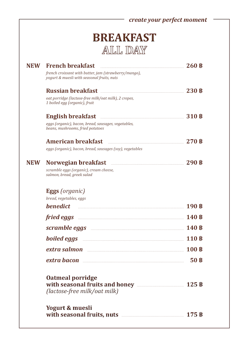 The menu boasts a delightful selection of all-day breakfast options that reflect a fusion of flavors. Start your day with the Norwegian breakfast, featuring fluffy scrambled eggs paired with creamy cheese, succulent salmon, and fresh bread. For a taste of France, try the French breakfast, which includes a buttery croissant served with homemade jams and a refreshing muesli topped with seasonal fruits. Those seeking nostalgic comfort might enjoy the American breakfast—a hearty plate of eggs and crispy bacon that's sure to satisfy any morning cravings.